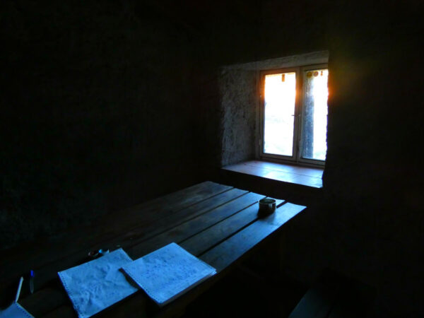 Au contraire, nous avons été très surpris lorsque, dix minutes plus tard, le sentier a soudainement émergé de l’épaisse forêt et s’est ouvert sur une vue spectaculaire sur les cratères sommitaux et les coulées de lave ! Le Rifugio Carpinteri est un grand refuge en bois et en pierre, bien équipé, mais malheureusement fermé à clé (pour éviter le vandalisme des imbéciles habituels !). À côté du refuge, en revanche, le charmant bivouac en pierre de lave est ouvert et accessible. À l’intérieur, on trouve seulement quelques casseroles et poêles, une cheminée, une table et une chaise. Et les dessins et signatures des visiteurs.