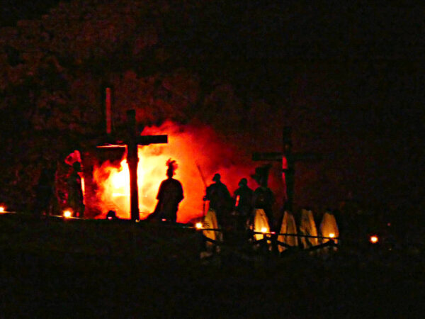 Lors du dimanche des Rameaux, la ville entière se met dans la peau des personnages de la Passion : soldats romains, grands prêtres, bergers, femmes de Jérusalem… Les scènes clés de la Passion du Christ se déroulent dans des points précis de la ville, et le public de fidèles se déplace – accompagné des « acteurs » – dans des ruelles étroites, des cours et des petites places. Une fois arrivés à l’Église Mère, l’acte final a lieu : la condamnation, la flagellation et la marche vers le Calvaire. Le public ne peut pas aller plus loin, seulement admirer d’en bas Jésus et les soldats qui montent un long escalier rocheux jusqu’au sommet du rocher… où, au milieu d’une musique évocatrice et de passages récités de l’Évangile, se déroule la crucifixion et la résurrection du Christ (PHOTO SUR LE CÔTÉ).